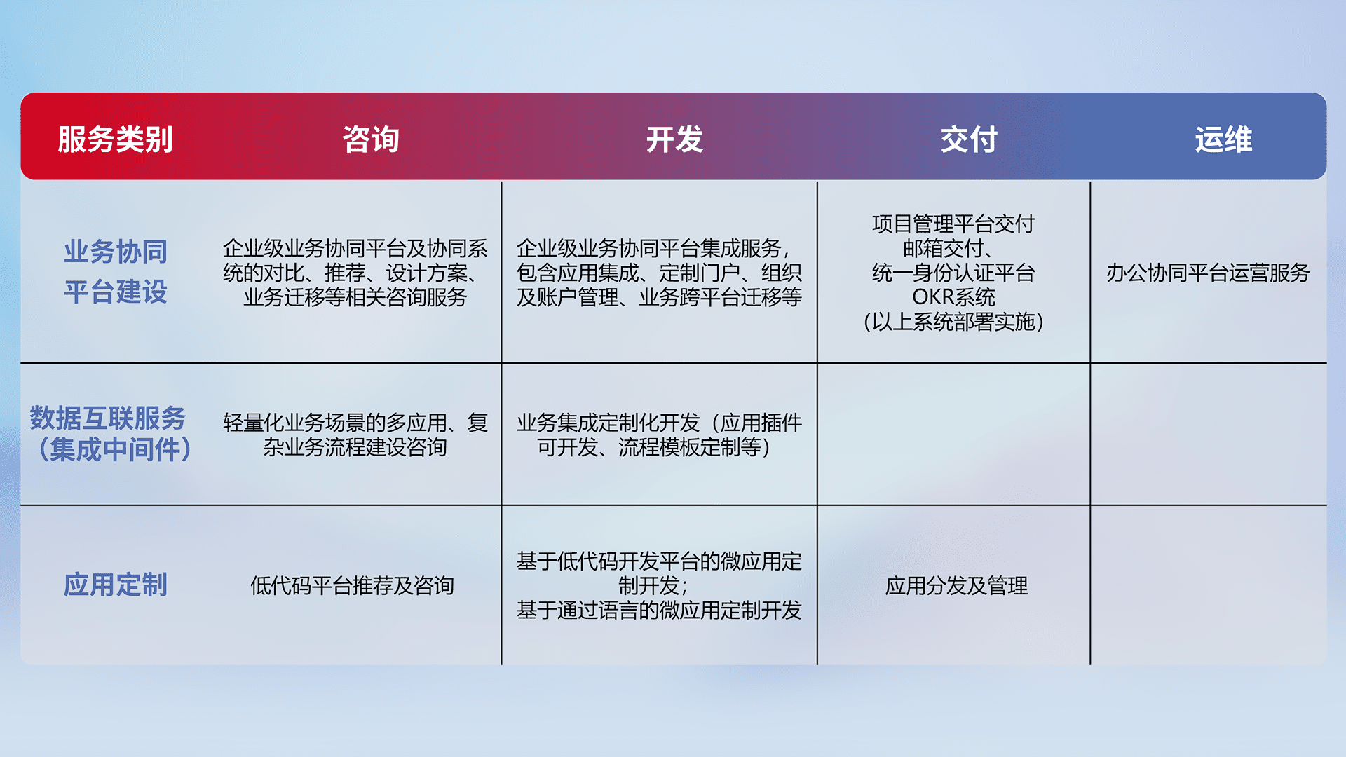 针对钉钉、、、企微、、、IDaas等平台级产品提供产品的规划、、、方案、、、、交付、、、、定制化开发等服务,,,实现如统一协同办公、、、、智能客户服务、、、、混合会议管理、、、、智能数据查询、、、、等业务场景,,,实现数字化转型。。