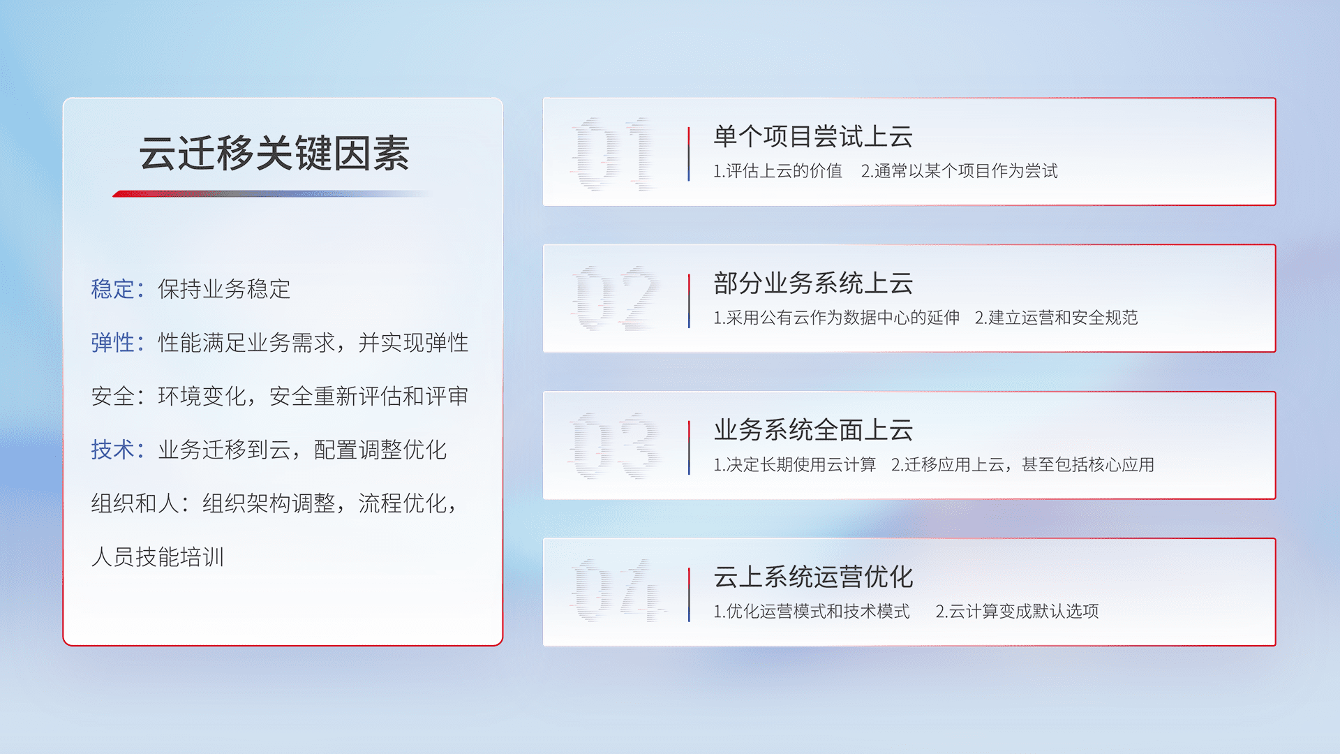 结合实际业务,,,从规划设计、、、、云平台选型、、、云原生改造、、数据迁移、、、、集成交付,,,迁移全过程为客户识别最佳上云路径,,,,做好风险识别管理,,,,设计网络架构、、、、身份权限、、安全审计合规、、、操作审计、、、、日志审计、、、监控告警策略、、多站点容灾设计等,,,,对云上基础设施进行整体规划,,提升IT治理水平,,,,以满足弹性、、高可用、、、、高性能的需求。。