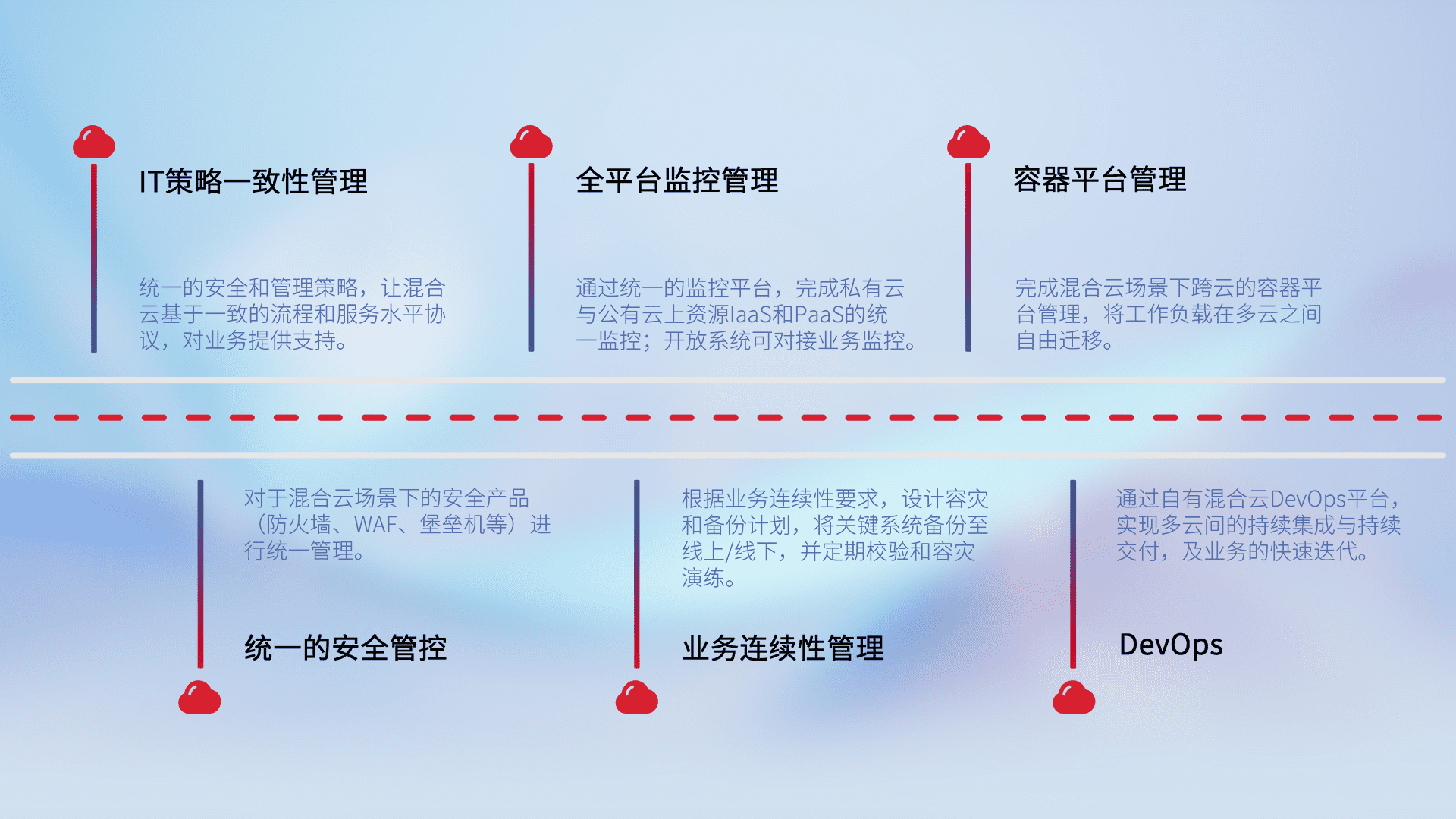 通过多云纳管,,,,以统一的资源数据模型把客户的云资源进行抽象和封装,,进而实现对多云资源的统一操作,,保障云资源管理的可靠性、、、稳定性与可用性。。。。量身定制化运维内容,,配置、、、、开发运维、、、、补丁管理、、备份、、、监控、、、、认证和访问管理、、审计和日常巡检等,,,保障在用云过程中的可靠度,,,稳定度以及高可用率。。